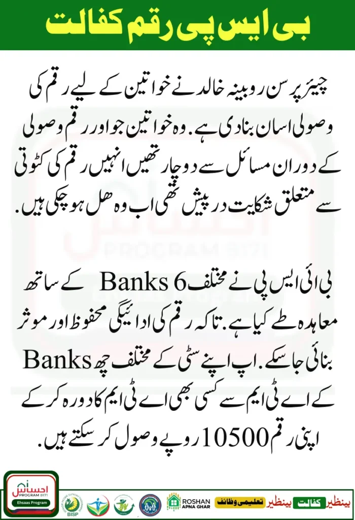 BISP has agreed with 6 different banks. So that Kafaalat payment 10500 of money can be made safely and efficiently. You can withdraw Rs 10500 by visiting any of the six ATMs of different banks in your city.